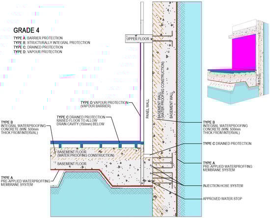 Conventional Basement wall and floor configuration with waterproofing details for Types A to D.