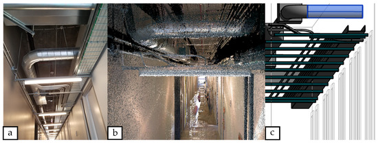 The researchers partnered with a large electrical subcontractor in the southwest region of the United States for developing the materials required for this experiment. The partner company regularly provides as-built BIM content as part of their close-out deliverables. To support this process, the company often uses laser scanning to collect accurate point clouds of as-built conditions to compare to planned BIM content. This partner company provided BIM development and field capture services for this research to create an accurate point cloud, which was used to generate an accurate as-built model for the targeted space for field verification, as shown in Figure 1.