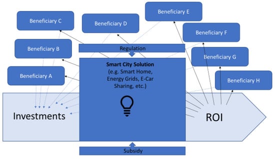 To further deepen the understanding of the scaling process of smart city solutions, the connected solutions and benefits model was suggested by Alanus von Radecki and first used in the Triangulum project []. The basic principle behind the replication of smart city solutions lies within economies of scale [] meaning that the cost advantage for a company increases with the increased output of goods or services. However, the conventional business models of scaling would not work with smart city solutions.