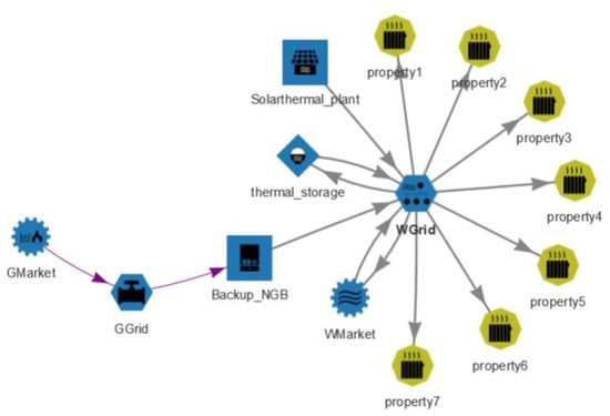 In a second step, the input data are transferred to a modeling toolbox establishing the specific energy system model of the demo district. The modeling framework IRPopt (Integrated Resource Planning and optimization, version hash: 847078050cdd3535be63d564bae71b49c6b1f741; by University of Leipzig, Leipzig, Germany) is an actor-oriented techno-economical optimization program that enables the modelling of a wide variety of different energy systems. []. For this case study, the demand-side (property 1–7) is linked with a balancing entity (WGrid) to reflect the district heating system that is fueled by the solar thermal plant (see Figure 5). In addition, a thermal storage and a backup facility are modelled to cope with the inter-temporal variability of the solar heat supply.