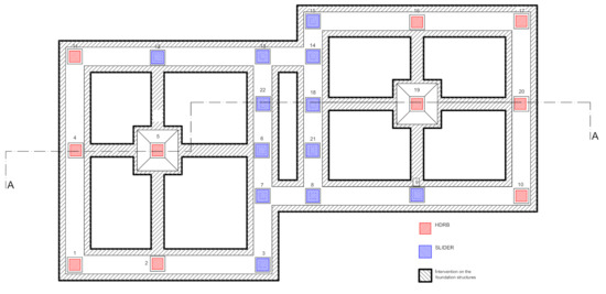 The fourth technique is based on the passive protection devices. This structural intervention is defined considering a base-isolation system, with elastomeric (i.e., HDRB) and sliding (i.e., steel-PTFE) bearings. The isolation devices are located at the foundation level (Figure 2). The resulting superstructure is a building with four stories above ground, and the structural system thus obtained is completely modified into a more compatibly seismic-proof building. The described configuration of the isolation system is defined to provide the required deformability and avoid the torsional effects. The modal response spectrum analysis is incorporated into the retrofitting analysis and the design of the isolation systems. Coherent with the function of investigating the building, the design goal does not damage the building’s superstructure.