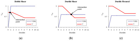 The properties of the plastic hinges have been defined according to the dimensions, details, and mechanical properties of each structural and nonstructural element. In this work, the simplified approach suggested in previous studies [35,36] has been taken into consideration. In fact, the shear failure is generally considered to be a brittle mechanism. Actually, two different behaviors should be considered: brittle shear and ductile shear. Brittle shear failure (Figure 3a) is dependent only on the shear strength. Ductile shear failure (Figure 3b) can be computed based on the intersection point of the flexural and shear behavior (Figure 3c).