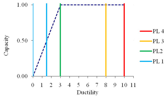 The damage levels considered are clearly connected with the PLs deliberated on by the Italian [31] and European [32] codes, namely, operative PL, limited (or light) damage PL, life safety PL, and collapse PL. Each damage level is characterized by a quantitative description based on the nonlinear status of the structural elements, in agreement with the code provision. Synthetically, Figure 4 shows the structural element performance required by each damage level. The structural performances are assessed using local parameters (the ductility ratio of beams and columns). Then, the structural performances are linked to the global damage level using a specific damage model [6], as reported in Figure 4.