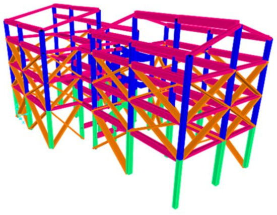 The fragility assessment of a building is carried out to achieve the goals of this study. The existing buildings and all the different schemes of the retrofitted buildings are modeled with SAP 2000 V21 [34]. This software is selected for its characteristics and for its widespread use among professionals. In order to evaluate the seismic response of the case study, a nonlinear model is defined. Frame objects are used to model beams, columns, and truss elements in 3D systems. Nonlinearity is modeled through the assignment of frame hinges. Other codes, perhaps more reliable but also more complex to use, have been excluded.