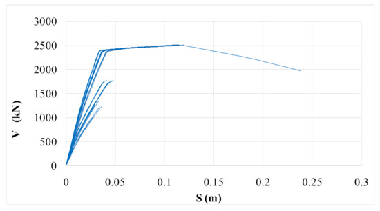 Capacity curves (Base shear V—Roof displacement S) of the building under study (current state, longitudinal and transversal direction).