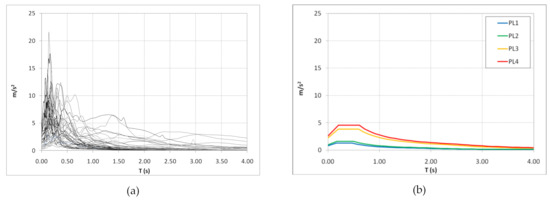 Elastic spectra of the considered records (a) and PL spectra code (b). Here, the elastic spectra derived from the code for the building under study are reported.