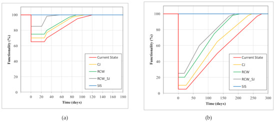 The recovery time is defined based on the inactivity time (pseudo-horizontal phase) and the repair activities (recovery time). The inactivity time is, in turn, evaluated based on the existing post-earthquake data and the specific evaluation of the strategic role of the investigated building. The inactivity time and recovery time depend on the considered performance level. The repair activities are evaluated in accordance with the repair and retrofitting techniques contemplated, and are evaluated based on the current prospectus for the Basilicata region. Consequently, the functionality curve is defined considering the building with a low damage level and higher damage levels. The considered control times are respectively TLC = 120 days and TLC = 300 days. Lastly, the resilience performance of the investigated building and the considered retrofitting techniques are evaluated, as reported in Figure 10.