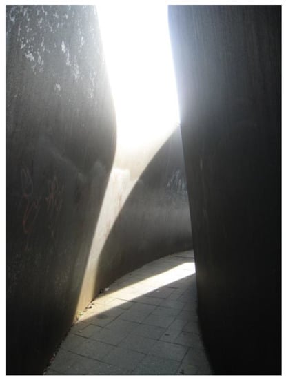 4]. Devoid of any paint hiding the essence of the material, the raw surfaces perfectly reflect the spirit of the spontaneous protests by Gdańsk shipyard workers. The corroded surface of the façades, however, is only a complement to the primary formal idea behind the project, referring to the once existing steel stockpile required for shipbuilding—hence the consistent parallel alignment, and the inclination from the upright position of the rust-colored walls, so that they directly relate to the metal sheets leaning against the storage racks (