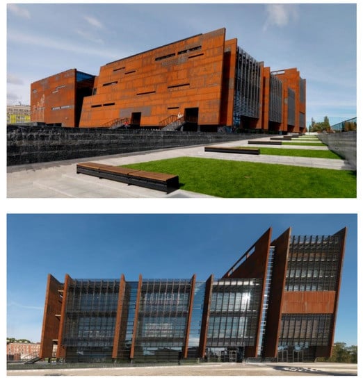 The façades of the town museum building in Essen, Germany, which were built in 2009, and the city archives of Haus der Essener Geschichte—Stadtarchiv are completely covered with corten cladding. According to the authors’ intention, the time-varying, maturing patina of corten steel sheets illustrates the passing of time, directly referring to the function of the building housing the documentation of the city’s history. The brutal, tin block is also related to the landscape of the industrial complex of the Krupp steel plant—Kruppstadt Essen, for many years an essential condition for the city’s existence (