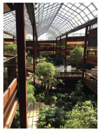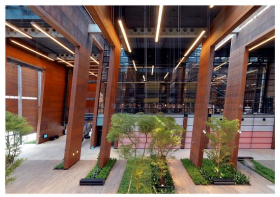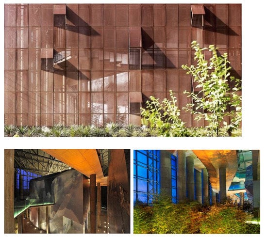 18]. At present, the vegetation in the winter garden is in the initial stage of growth, eventually becoming an element competing with the severity of corten. This applies at least to the lower part of the room, the total height of which is approx. 15 m.