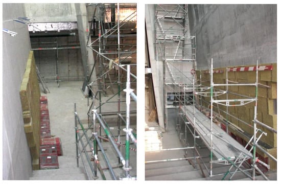 These effects are mitigated to some extent by the use of a drawn mesh made of corten plate and perforated corten plates, moved away from the concrete wall, and the filling of the voids with mineral wool. When applied to the upper part of the wall, it preserves the homogeneity of the interior material and minimizes excessive reverberation, directing the auditory sensations of the users from the expected clear industrial monumentality to the acoustic neutrality typical of public spaces.