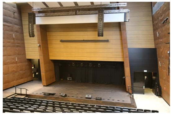 Figure 10). During the test, a comparison between the audibility of the echo to a listener positioned in the central part and at the edge of the stage was carried out, with and without sound-absorbing material. The source of the sound was a pistol shot, speech and selected musical instruments.