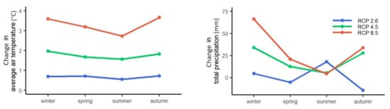 In addition, there is an increase in projected precipitation loads for all seasons of RCPs 4.5 and 8.5. This, however, could induce an increase in the damage risk [,,]. In winter, the precipitation load increases the most for RCP 8.5 (+27%), followed by autumn. For RCP 4.5, the winter and autumn anomalies are similar (+14%). RCP 2.6, on the other hand, illustrates an increase in winter (+2%) and summer, whereas the spring and autumn precipitation decreases. The annual and seasonal average temperature and precipitation loads are listed in Table 3. Further, the daily average temperature (Figure A1) and daily total precipitation amount (Figure A2) are included in Appendix A.