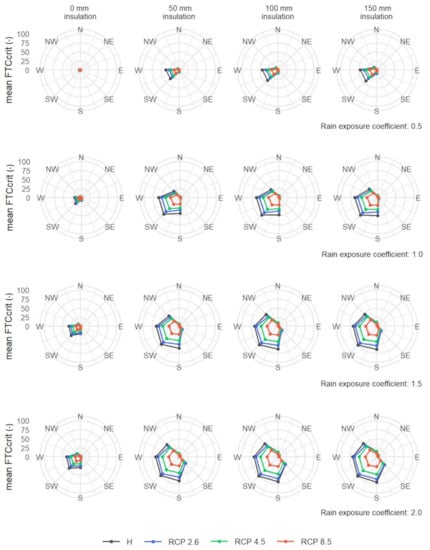 Mean number of critical freeze-thaw cycles (FTCcrit) per orientation for the 300 mm masonry wall of cluster 4 for the historical period (H) and RCP projections. The uninsulated wall and 3 insulated walls with varying thicknesses are presented for each of the rain exposure coefficients.