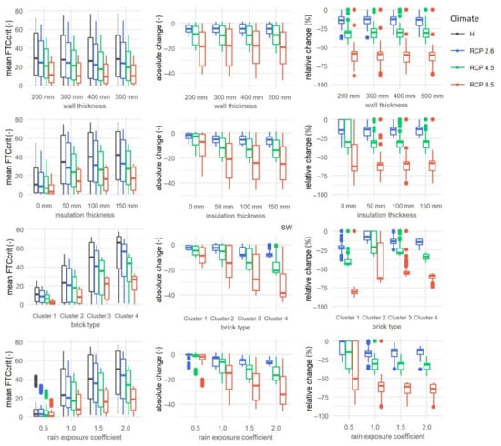 The distribution in yearly mean FTCcrit is similar for the different wall thicknesses, as are the absolute and relative climate change impacts, i.e., on average −58% for RCP 8.5. The same is observed for the insulation thickness, excluding the uninsulated case. The average change for the three insulated walls is −60%, whereas the uninsulated wall results in a decrease of −51% (RCP 8.5). However, the median decrease is larger for the uninsulated wall. In addition, the range of the uninsulated wall, i.e., approximately from −0% up to −90%, is considerably larger than the insulated walls, excluding the outliers, which goes from about −40% to −80%.