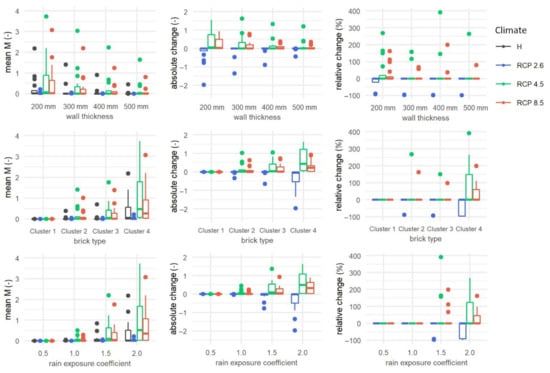 The distribution of the annual average M at the interior wall surface of uninsulated walls as well as the change towards the end of the 21st century depend on the wall thickness, brick type and rain exposure coefficient. Between the different wall thicknesses, M is the largest for the 200 mm wall, as is the change for the different projections. This is expected since moisture from WDR events has a higher chance of reaching the interior surface for thinner walls. Of the four brick types, cluster 4 is most at risk. Further, M increases with an increasing rain exposure coefficient, as higher rain exposure coefficients lead to deeper moisture diffusion in the wall. Except for some outliers, the absolute and relative change in the yearly average M is low for masonry walls thicker than 300 mm, for brick type clusters 1 and 2 and for rain exposure coefficients smaller than or equal to 1.0.