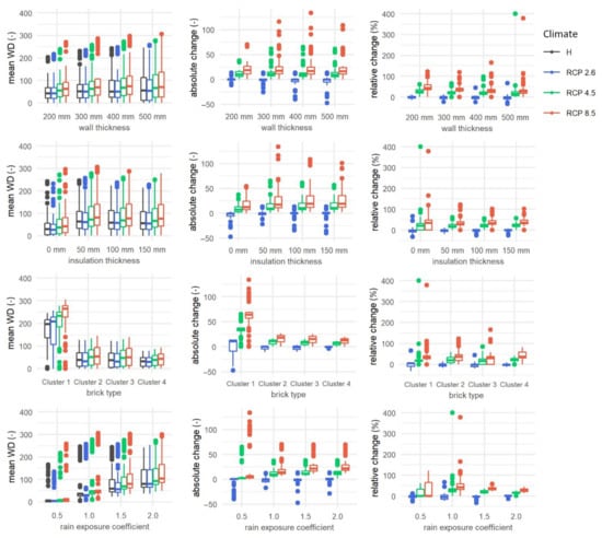 Mean value, mean absolute and mean relative change in the WD for the SW orientation per parameter variation: wall thickness, brick type, insulation thickness and rain exposure coefficient.