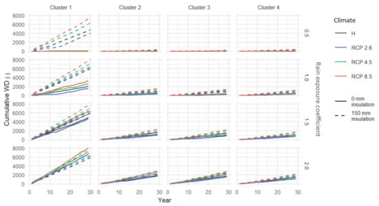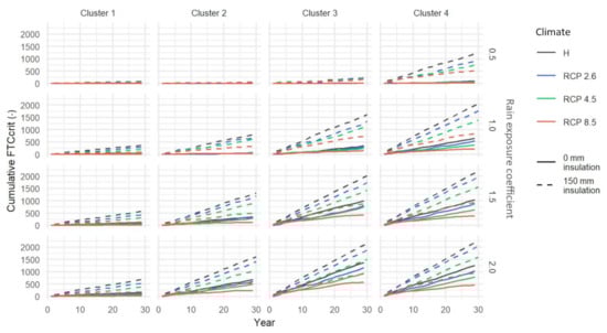 Further, in some cases, the number of FTCcrit for the uninsulated wall during the historical period is equal to or higher than the number of FTCcrit for the internally retrofitted wall during the future period. This means that the increase in the freeze-thaw risk due to the application of internal insulation is compensated by changing climate conditions and thus the changing hygrothermal behaviour of the masonry. This is the case for RCP 8.5 when the rain exposure coefficient is 2.0. For some brick types, i.e., clusters 3 and 4, it already occurs at a rain exposure coefficient of 1.5 (RCP 8.5). In one case, the projected number of FTCcrit of the retrofitted wall for RCP 4.5 is equal to the historical freeze-thaw risk of the uninsulated wall.