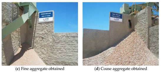 In this work, construction and demolition waste was used to produce both fine and coarse recycled aggregated (RA) in replacement to usual aggregate to produce concrete. The waste used came from a civil construction recycling plant and its composition contains materials from several origins like excavation residues, demolition of simple and reinforced concrete elements, the residue of ceramic masonry materials—bricks and tiles—and also mortar cement-based bricks and mortars. Before processing the RA, an initial manual separation was carried out to remove materials such as wood, plastic, and plaster. The material is, then, taken to a RA recycling plant where it begins its processing that can be summarized as it follows: (a) feeding and pre-screening, (b) aggregate scrubbing, (b) contaminant removal, (c) metals and others undesirable materials removal, (d) sand washing, (e) aggregate sizing, (f) primary stage water treatment, and (g) deposited in bags according to their granulometry. Figure 1 shows a general view of the RA recycling plant.