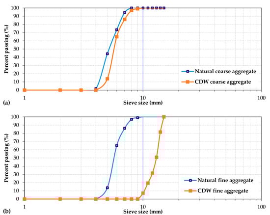 Aggregate size distribution: (a) Natural and RA coarse aggregates; (b) natural and RA fine aggregates.