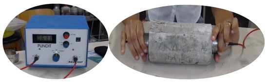 Ultrasound tests were performed on all specimens according to NBR 8802 []. One day before starting the ultrasonic wave speed tests, all specimens were removed from the chamber to surface drying. PUNDIT equipment with a 500 kHz longitudinal transducer frequency was used and placed so that the wave reading was directly transmitted—the most efficient way of transmitting the ultrasonic wave in continuous media [].