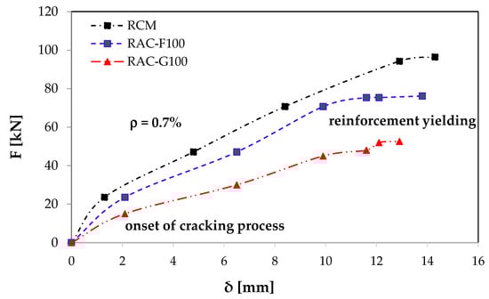 Figure 6 shows a graph which typifies the dependence of the force F on the vertical displacement δ. This graph overall characterizes the experimental data obtained from the tests performed. Three different behaviours can be observed in this figure and the beam produced with RAC-G100 is the one that presented the greatest discrepancy when compared to the RCM beam. This shows that the beam made with RAC-G100 proved to be less efficient to the flexural behaviour, an aspect that validates the other experimental results performed.