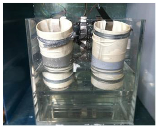 A Vickers micro-hardness test was performed to measure the micro-hardness of the ITZs. A load of 0.01 kg with 10s contact time has been applied to the region of 100 µm away from the surface of aggregates. The chloride migration test was performed according to the NT BUILD 492 [28] procedure. A silver nitrite indicator solution (Figure 3) was used to measure the chloride migration depths of 100 × 50 mm cylinder specimens and the non-steady-state migration coefficients (Dnssm) were computed based on the formulas reported by Luo and Schutter [29]. The water penetration tests were conducted according to TS-EN 12390-8 [30] at the age of 28 days. For that purpose, one side of 150 mm cube specimens was exposed to water for a pressure of 500 ± 50 kPa for 72 hours. The specimens were then split into two halves by using the compressive test set-up. At the final stage, the water penetration sections on the lightweight cement composite surface were highlighted and the maximum depth of the penetration of the water in specimens was recorded.