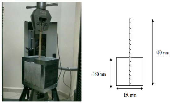 Pull-out tests were also carried out to assess, to some extent, the performance of this nano-modified lightweight cementitious composites in structural applications. For that purpose, the reinforcing ribbed steel-bar of 14 mm diameter was extracted from the lightweight cementitious composites cube specimens with a size of 150 × 150 × 150 mm at the age of 28 days (Figure 4). A controlled displacement test according to ASTM E1512-01 [32] was carried out at a fixed displacement rate of 0.5 mm/min, and the reactive load was recorded and then, the bond stress was calculated using by Formula 2.