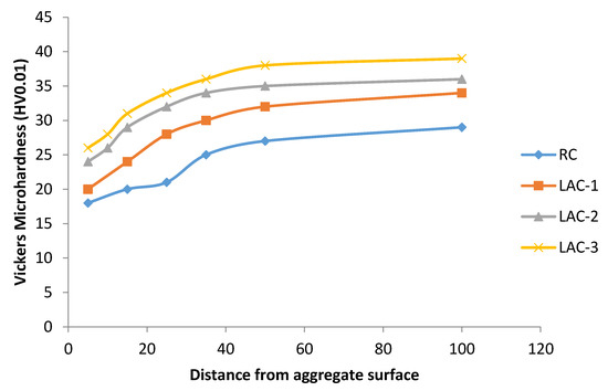 Figure 7 illustrates the relationship between the average micro-hardness (strength) distribution measured in the interfacial transition zone of each lightweight mix and the distance from the aggregate surface. The results clearly show that there are noticeable differences between the specimen behaviors. In the mix encompassing 3% nano-silica particles, the micro-hardness at the distance of 50 µm away from the sintered fly ash aggregate surface reached a level of 38 HV 0.01, while it was only 29 HV 0.01 for the reference mix which does not contain any nano-particles.