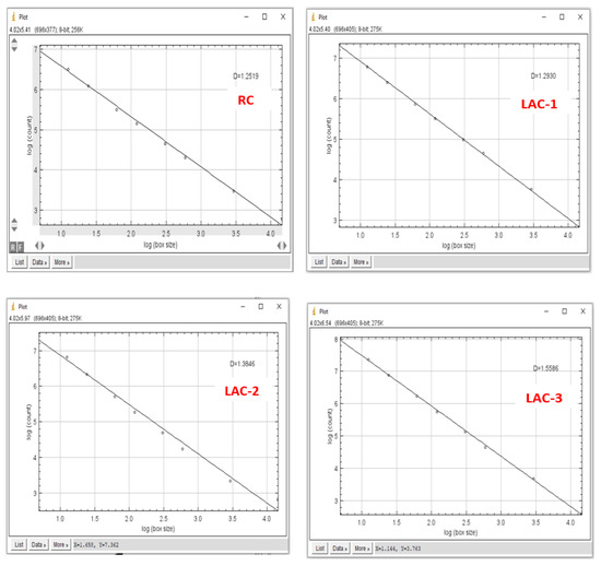 The fractal size values of the fracture surfaces obtained by Image J program are illustrated in Figure 10. The results clearly show that the lightweight mix with a percentage of 3 % nano-silica particles (LAC-3) has the highest fractal dimension value among the mixes. In addition, the other nano-silica reinforced lightweight samples had also a fractal dimension greater than the reference lightweight mix (RC). The higher fractal dimension of the LAC-3 mix led to the dissipation of a higher fracture energy at the macro scale level as confirmed by the results presented in Table 2. The higher fractal dimension values associated with the addition of nano-silica particles revealed that the unsaturated bonds significantly reduced the hydrophobicity and static contact angle for the nano-silica improving the bond ability between them and hydration products and producing the toughening mechanism along the crack front and voids.
