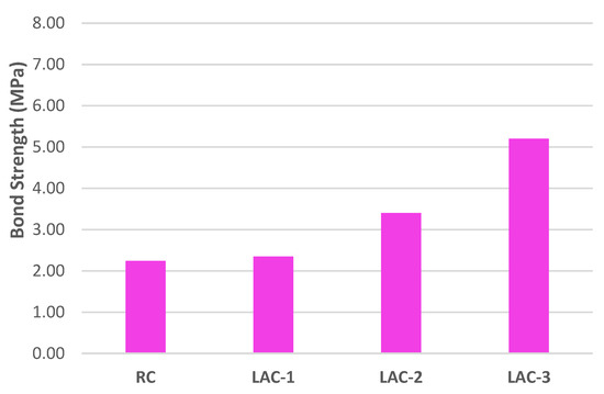 The influence of the nano-silica modification on the bond strength of the lightweight cementitious mixes is shown in Figure 16. The addition of nano-silica to the cementitious matrix resulted in an increase in the bond strength of the lightweight concrete. Compared to the reference mix, the 28 days bond strength improvement ratios of the samples including nano-silica particles with the proportions of 1%, 2%, and 3% by weight of cement were 4.91%, 51.7%, and 132.1%, respectively.