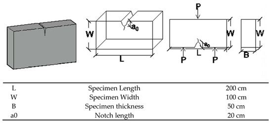 To study the fracture toughness, the resistance-curve method was used. Experiments were carried out on single edge notched bend (SENB) [33]; the specimens were molded in metallic molds with a notch to width ratio (a0/w) of 0.4. The specimens were subjected to three-point bend loading in an electromechanical testing machine UTM7001 Model 4002 (Utest, Ankara, Turkey) as seen in Figure 1. The resistance-curve experiments were carried out on specimens left in the laboratory environment at a temperature of 27 °C for 7 days, 14 days and 28 days. The specimens were loaded at a ramp rate of 1.2 N/s to examine the possible crack propagation; this was achieved with a proscope video monitoring system. The video obtained from the proscope was analyzed with the scientific imaging software “image J 2”, which was used to investigate the crack/microstructure interactions that resulted in the resistance-curve behavior. Loading was carried out until the specimens broke into two or more pieces. The critical stress intensity factors were then calculated using the following expression: