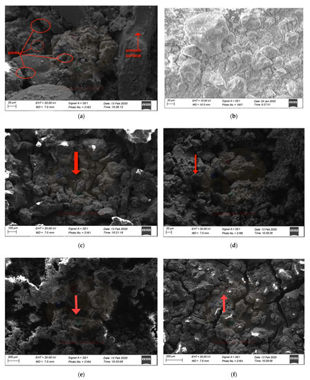 SEM micrographs of: (a) unstabilised termite mound soil; (b) Ordinary Portland Cement; (c) specimens containing 5 wt% of stabilisation; (d) specimens containing 10 wt% of stabilisation; (e) specimens containing 15 wt% of stabilisation; (f) specimens containing 20 wt% of stabilisation.