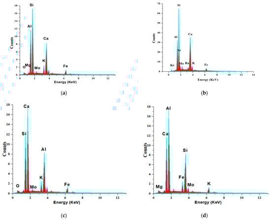 EDX micrographs of: (a) specimens containing 5 wt% of stabilisation; (b) specimens containing 10 wt% of stabilisation; (c) specimens containing 15 wt% of stabilisation; (d) specimens containing 20 wt% of stabilisation.