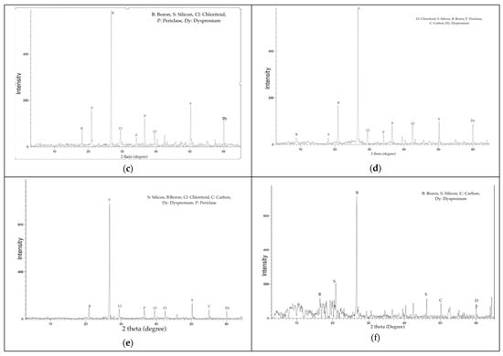 XRD spectra of: (a) unstabilised termite mound soil; (b) Ordinary Portland Cement; (c) specimens containing 5 wt% of stabilisation; (d) specimens containing 10 wt% of stabilisation; (e) specimens containing 15 wt% of stabilisation; (f) specimens containing 20 wt% of stabilisation.