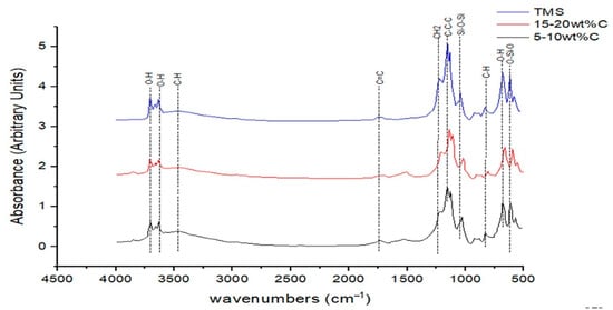 The results show that the spectra are dominated by C–C–C bending, O–H stretching-bending and O–Si–O bending bands. In the stabilized mixtures, these bands remained the same, with some displacement. This can be explained by the evident substitution of the Si–O bounds by Si–O–Al, resulting in the dissolution of the reactive phases (silicon, aluminum) [42].