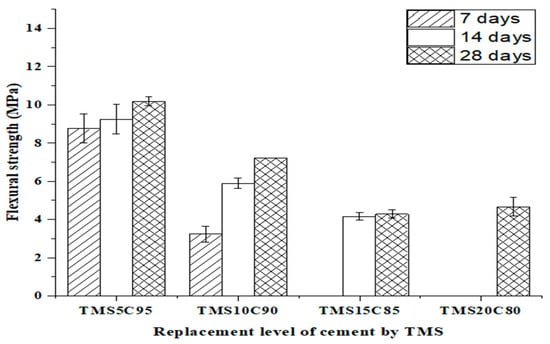 Flexural strength of the various samples with 5, 10, 15 and 20% stabilizations designated as TMS5C95, TMS10C90, TMS15C85 and TMS20C80 respectively at the curing ages of 7, 14 and 28 days.