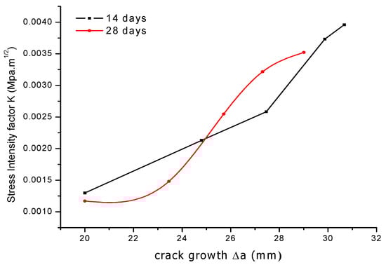 The results for the fracture toughness tests are presented in Table 3. In this study, three-point bending tests were carried out on SENB specimens made from stabilized and unstabilized TMS in order to understand the mechanical behavior and crack propagation mechanism in the material to ascertain the cement stabilization’s effect on the toughness of the TMS. The resistance curve obtained in Figure 8 gives the main information about initial and final stress intensity factors (K0 and K respectively) and the ratio between the crack length and the specimen depth (a0/W) obtained from the R-curves of individual samples tested for the different curing days (7, 14 and 28 days). The SENB technique allowed us to plot the R-curve as a function of crack propagation Δa; the evolution of cracks follows three stages [44]: