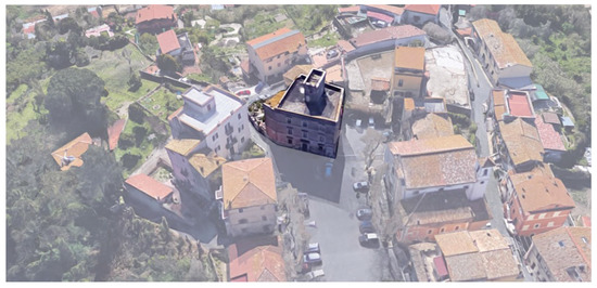 The castle (Figure 2) is located on the top of the promontory and overlooks the main square of the city. The building was rebuilt between the end of the 19th century and the beginning of the 20th century on previous tufa blocks of medieval age. The current castle with a central clock tower and cornices characterized by fortresses battlements, dates back to 1908, and from 1922 to 1969 was used for charitable activities, i.e., kindergarten for indigent children or sewing school. The complex is owned by a Public Institution of Assistance and Charity.