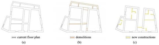 The castle of Cesano Romano: (a) Current floor plan, (b) demolitions, and (c) new constructions.