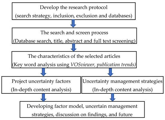 The aim of this paper was to conceptualise project uncertainty by identifying uncertainty factors in construction refurbishment projects and uncertainty management strategies. First, a systematic literature review method was followed to identify the determinants of project uncertainty and to develop the factor model. A systematic review of the literature provides better identification of determinants, management strategies, gaps and trends in the context of studies and provides future direction for potential enhancement in the construction industry. The methodological process followed in this research is illustrated in Figure 1.