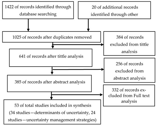 Developing a protocol is an important step in the process of reviewing quality literature [41]. This review adopts the guideline of Preferred Reporting Items for Systematic Reviews and Meta-Analysis (PRISMA) [42]. The review protocol consisted of two main inclusion criteria: (1) studies that revealed determinants of project uncertainty, uncertainty management and studies that were conducted in the context of projects or particular to building refurbishment (2) well-esteemed peer-review journals and conference papers and Phd thesis published in English. Structured searches were carried out using four databases including, Web of Science, Google Scholar, Science Direct and Scopus from commencement to April 2020. There is a dearth of literature relating to project uncertainty in building refurbishment projects. Therefore, in order to capture the most relevant determinants of uncertainty, both the literature on project management and building refurbishment was viewed. Therefore, the keywords used in the searches were: ‘Uncertainty’, ‘Project management’, ‘Building refurbishment’, and ‘safety’. Additionally, further articles were added through cross-referencing initially selected articles. The article selection process comprised three steps: (1) Title screening (641 studies were selected), (2) abstract screening (385 studies were selected), and (3) full-text screening. Finally, 53 articles were utilised to conceptualise the theoretical understanding of project uncertainty. Figure 2 illustrates the article selection process according to the PRISMA flowchart.