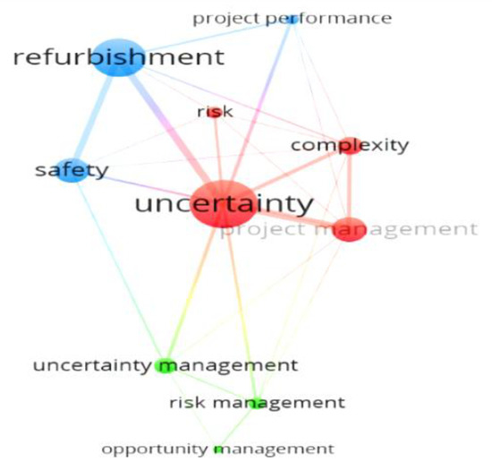The scientometric analysis of author keywords is accompanied by VOSViewer, which indicates the frequency of occurrence of key themes and their inter-relatedness. Several steps were followed in including and excluding keywords, (1). The threshold value was set as to a minimum of two occurrences. (2). The general themes, such as “buildings”, “construction”, and “human factor” were removed. (3). Keywords with the same meaning were merged, for example, “safety-critical”, “safety”, “uncertainty management”, and “managing uncertainty”. Finally, 10 main author keywords were shortlisted as envisaged in Figure 4.