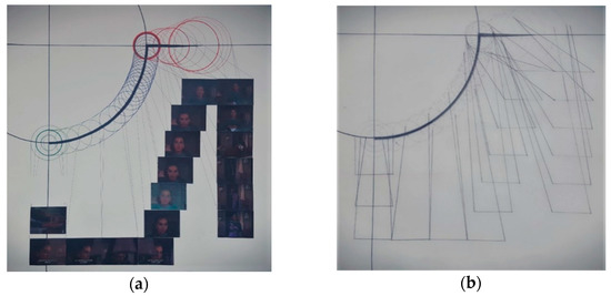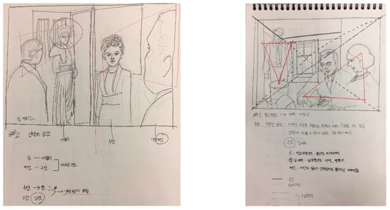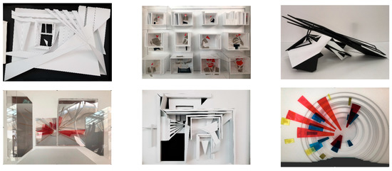 Sketching is another means to communicate what is happening inside the designer’s mind. Many activities and processes, such as conception, perception, evaluation, decision making, and representation, occur during conceptual designing [49]. After watching the selected films listed above (in Section 3.3), the students selected their own interesting scenes to analyze and then extracted the lines or circles and derived layers for creating a new space. In this step, the students did not focus on the concept of a city or a building; instead, they focused on creating a filmic space and making a single, completed space by using different aspects of each layer founded on conceptual sketches. For instance, the students chose various elements, including the movement of the camera angle, the static/dynamic coexistence between actors, and their emotions. The students sought to emphasize lines, faces, and spatial aspects using various materials (see Figure 3).