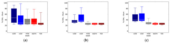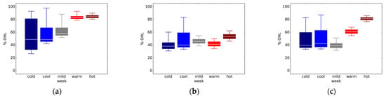 Figure 2, Figure 3, Figure 4 and Figure 5 show the thermal, visual, ventilation, and overall OHL, respectively. Each chart shows the OHL for the five event weeks. The OHL range for each event week is represented by a box plot showing the median, 25th, and 75th percentile (lower and upper bound of the box) and 5th and 95th percentile (lower and upper bounds of the line). A few key observations: