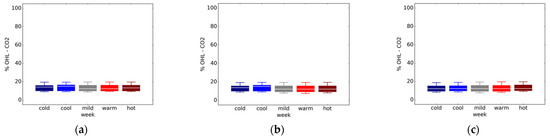 - Ventilation OHL: There was very little variation across locations, weather weeks and within weather weeks. This was somewhat to be expected as the only parameters affecting CO2 level in our simulation model are the infiltration rate and occupant density.