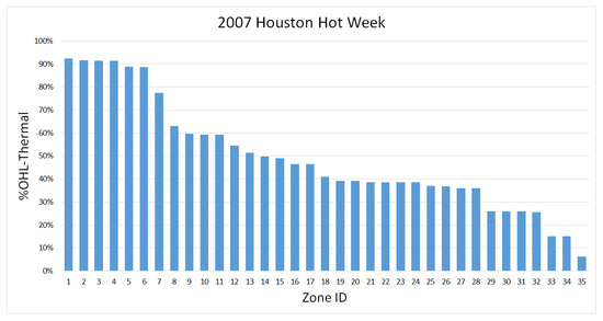 Finally, we would note that OHL varied significantly across different zones in the building. For example, Figure 6 shows the thermal OHL in different zones for a hot weather week in Houston, which ranges from 6–92%. While our analysis and results in this paper focus on building level OHL, some stakeholders may be interested in analyzing zone level OHL to inform and prioritize building resilience interventions. OHL metrics allow for such analyses since they can be computed at various levels of spatial and temporal aggregation.