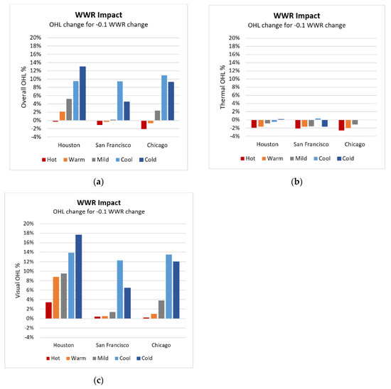 - For WWR, as expected, visual OHL increases while thermal OHL generally decreases with a decrease in WWR. But the impact on visual OHL is an order of magnitude higher than the impacts on thermal OHL, especially in cool and cold weeks, and this, in turn, is reflected in the overall OHL. For example, in Houston WWR impact on thermal OHL ranges from about −2.6% to +0.4%, while WWR impact on visual OHL ranges from about 0.2 to 17.6%.