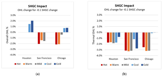 Impact of a 0.1 decrease in SHGC on overall (a) and thermal (b) OHL.