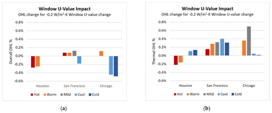 Impact of a 0.2 W/m2-K decrease in window U-value on overall (a) and thermal (b) OHL.